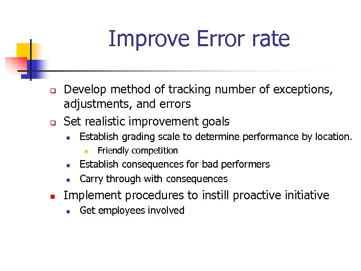 Improve Error rate q q Develop method of tracking number of exceptions, adjustments, and errors Set realistic improvement goals n Establish grading scale to determine performance by location. n n Friendly competition Establish consequences for bad performers Carry through with consequences Implement procedures to instill proactive initiative n Get employees involved