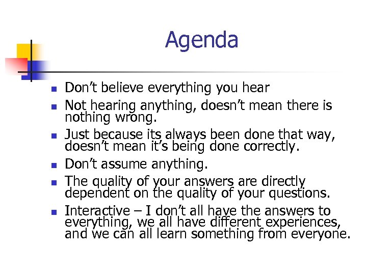Agenda n n n Don’t believe everything you hear Not hearing anything, doesn’t mean there is nothing wrong. Just because its always been done that way, doesn’t mean it’s being done correctly. Don’t assume anything. The quality of your answers are directly dependent on the quality of your questions. Interactive – I don’t all have the answers to everything, we all have different experiences, and we can all learn something from everyone.