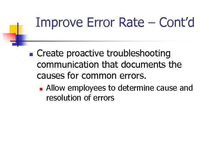 Improve Error Rate – Cont’d n Create proactive troubleshooting communication that documents the causes for common errors. n Allow employees to determine cause and resolution of errors