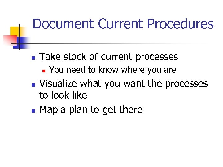 Document Current Procedures n Take stock of current processes n n n You need to know where you are Visualize what you want the processes to look like Map a plan to get there