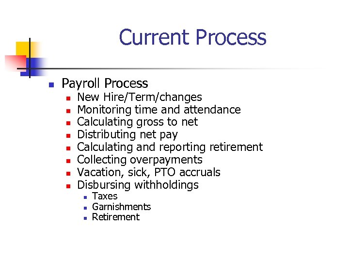 Current Process n Payroll Process n n n n New Hire/Term/changes Monitoring time and attendance Calculating gross to net Distributing net pay Calculating and reporting retirement Collecting overpayments Vacation, sick, PTO accruals Disbursing withholdings n n n Taxes Garnishments Retirement