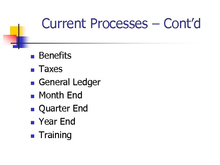 Current Processes – Cont’d n n n n Benefits Taxes General Ledger Month End Quarter End Year End Training