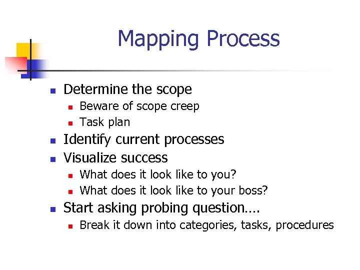 Mapping Process n Determine the scope n n Identify current processes Visualize success n n n Beware of scope creep Task plan What does it look like to you? What does it look like to your boss? Start asking probing question…. n Break it down into categories, tasks, procedures