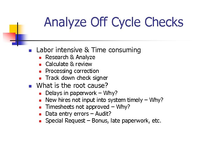 Analyze Off Cycle Checks n Labor intensive & Time consuming n n n Research & Analyze Calculate & review Processing correction Track down check signer What is the root cause? n n n Delays in paperwork – Why? New hires not input into system timely – Why? Timesheets not approved – Why? Data entry errors – Audit? Special Request – Bonus, late paperwork, etc.