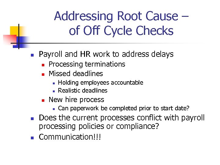 Addressing Root Cause – of Off Cycle Checks n Payroll and HR work to address delays n n Processing terminations Missed deadlines n n n New hire process n n n Holding employees accountable Realistic deadlines Can paperwork be completed prior to start date? Does the current processes conflict with payroll processing policies or compliance? Communication!!!