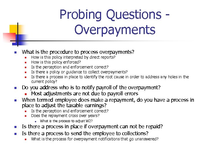 Probing Questions - Overpayments n What is the procedure to process overpayments? n n n n How is this policy interpreted by direct reports? How is this policy enforced? Is the perception and enforcement correct? Is there a policy or guidance to collect overpayments? Is there a process in place to identify the root cause in order to address any holes in the current policy? Do you address who is to notify payroll of the overpayment? n Most adjustments are not due to payroll errors When termed employee does make a repayment, do you have a process in place to adjust the taxable earnings? n n Is the perception and enforcement correct? Does the repayment cross over years? n n n What is the process to adjust W 2? Is there a process in place if overpayment can not be repaid? Is there a process to send the employee to collections? n What is the process for overpayment notifications that go unanswered?