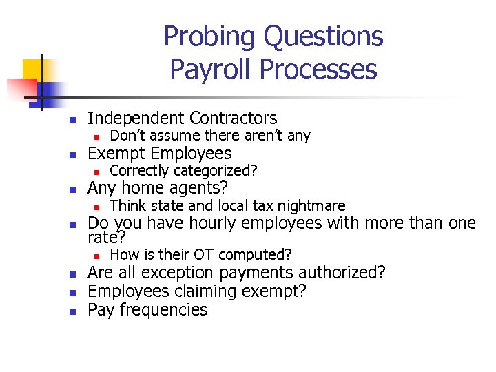 Probing Questions Payroll Processes n Independent Contractors n n n Think state and local tax nightmare n n Correctly categorized? n n Don’t assume there aren’t any How is their OT computed? Exempt Employees Any home agents? Do you have hourly employees with more than one rate? Are all exception payments authorized? Employees claiming exempt? Pay frequencies
