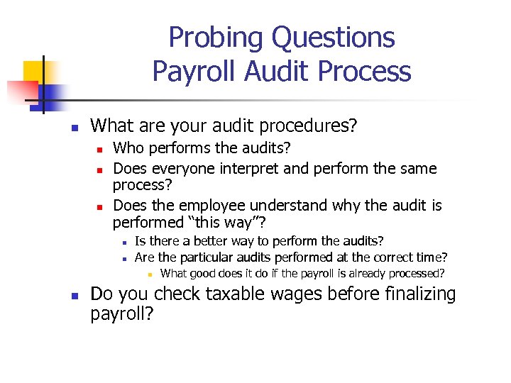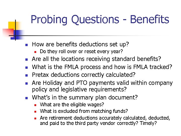 Probing Questions - Benefits n How are benefits deductions set up? n n n Do they roll over or reset every year? Are all the locations receiving standard benefits? What is the FMLA process and how is FMLA tracked? Pretax deductions correctly calculated? Are Holiday and PTO payments valid within company policy and legislative requirements? What’s in the summary plan document? n n n What are the eligible wages? What is excluded from matching funds? Are retirement deductions accurately calculated, deducted, and paid to the third party vendor correctly? Timely?