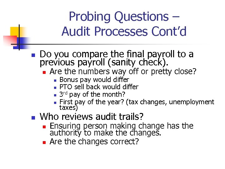 Probing Questions – Audit Processes Cont’d n Do you compare the final payroll to a previous payroll (sanity check). n Are the numbers way off or pretty close? n n n Bonus pay would differ PTO sell back would differ 3 rd pay of the month? First pay of the year? (tax changes, unemployment taxes) Who reviews audit trails? n n Ensuring person making change has the authority to make the changes. Are the changes correct?