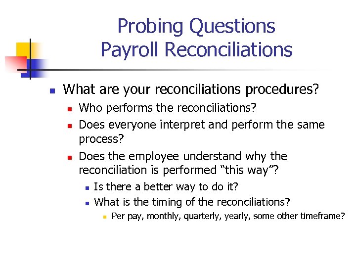 Probing Questions Payroll Reconciliations n What are your reconciliations procedures? n n n Who performs the reconciliations? Does everyone interpret and perform the same process? Does the employee understand why the reconciliation is performed “this way”? n n Is there a better way to do it? What is the timing of the reconciliations? n Per pay, monthly, quarterly, yearly, some other timeframe?
