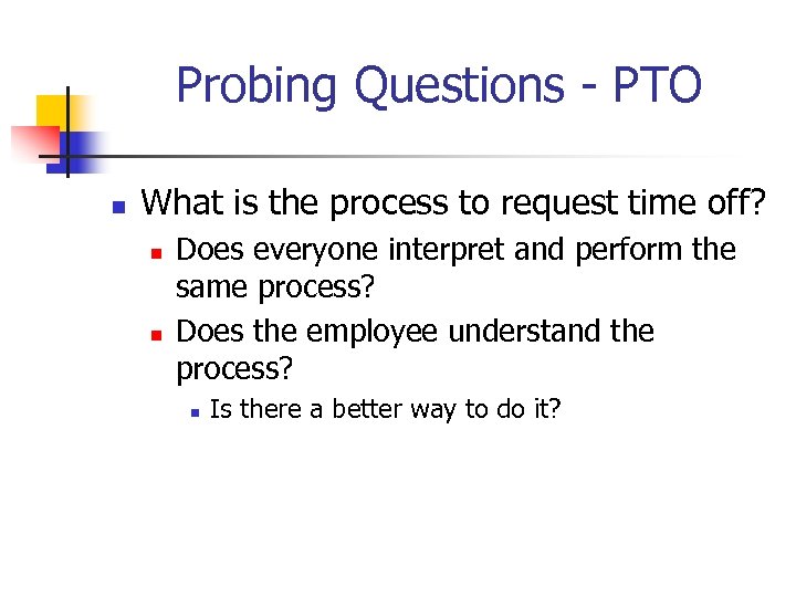 Probing Questions - PTO n What is the process to request time off? n n Does everyone interpret and perform the same process? Does the employee understand the process? n Is there a better way to do it?