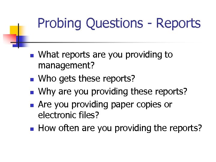 Probing Questions - Reports n n n What reports are you providing to management? Who gets these reports? Why are you providing these reports? Are you providing paper copies or electronic files? How often are you providing the reports?