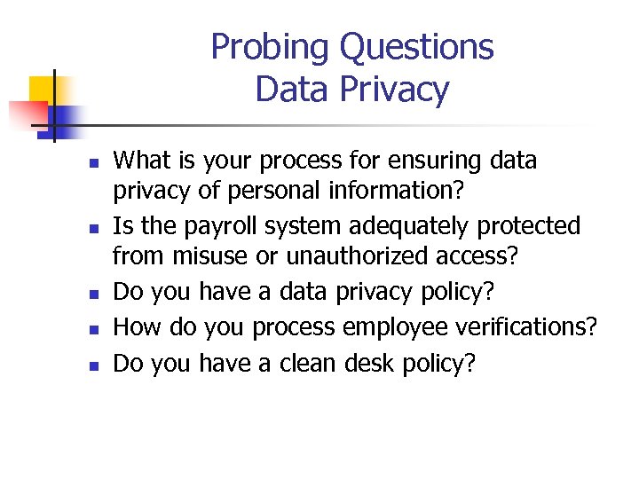 Probing Questions Data Privacy n n n What is your process for ensuring data privacy of personal information? Is the payroll system adequately protected from misuse or unauthorized access? Do you have a data privacy policy? How do you process employee verifications? Do you have a clean desk policy?