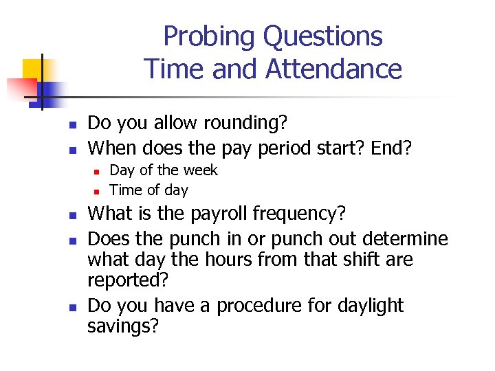 Probing Questions Time and Attendance n n Do you allow rounding? When does the pay period start? End? n n n Day of the week Time of day What is the payroll frequency? Does the punch in or punch out determine what day the hours from that shift are reported? Do you have a procedure for daylight savings?