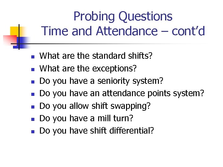 Probing Questions Time and Attendance – cont’d n n n n What are the standard shifts? What are the exceptions? Do you have a seniority system? Do you have an attendance points system? Do you allow shift swapping? Do you have a mill turn? Do you have shift differential?
