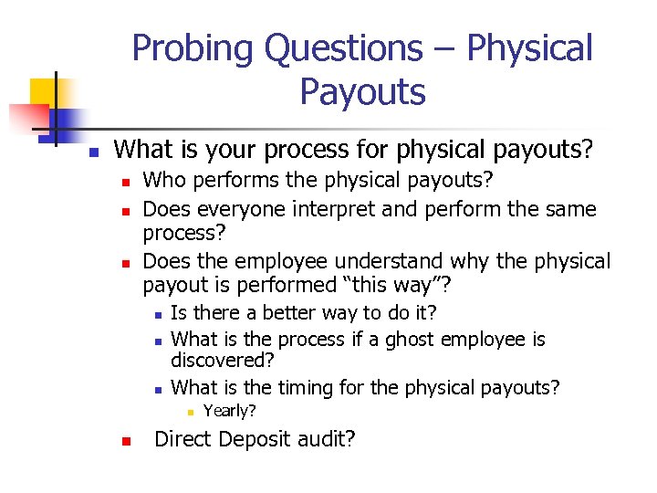 Probing Questions – Physical Payouts n What is your process for physical payouts? n n n Who performs the physical payouts? Does everyone interpret and perform the same process? Does the employee understand why the physical payout is performed “this way”? n n n Is there a better way to do it? What is the process if a ghost employee is discovered? What is the timing for the physical payouts? n n Yearly? Direct Deposit audit?