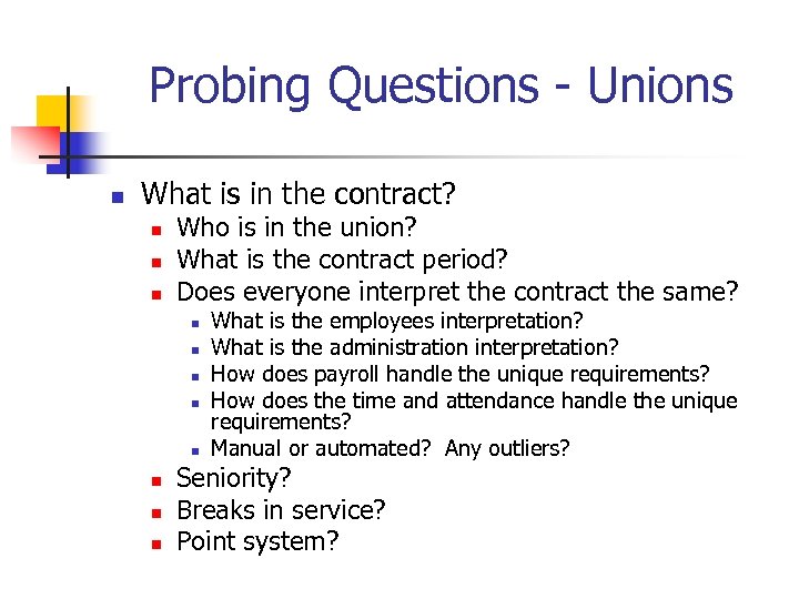 Probing Questions - Unions n What is in the contract? n n n Who is in the union? What is the contract period? Does everyone interpret the contract the same? n n n n What is the employees interpretation? What is the administration interpretation? How does payroll handle the unique requirements? How does the time and attendance handle the unique requirements? Manual or automated? Any outliers? Seniority? Breaks in service? Point system?