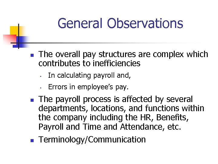 General Observations n The overall pay structures are complex which contributes to inefficiencies • • n n In calculating payroll and, Errors in employee’s pay. The payroll process is affected by several departments, locations, and functions within the company including the HR, Benefits, Payroll and Time and Attendance, etc. Terminology/Communication