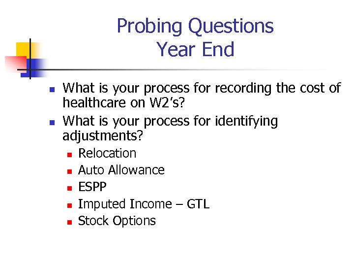 Probing Questions Year End n n What is your process for recording the cost of healthcare on W 2’s? What is your process for identifying adjustments? n n n Relocation Auto Allowance ESPP Imputed Income – GTL Stock Options