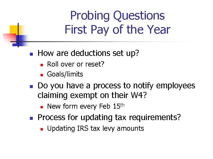 Probing Questions First Pay of the Year n How are deductions set up? n n n Do you have a process to notify employees claiming exempt on their W 4? n n Roll over or reset? Goals/limits New form every Feb 15 th Process for updating tax requirements? n Updating IRS tax levy amounts