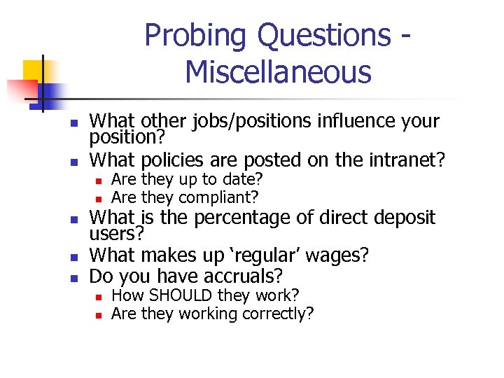 Probing Questions - Miscellaneous n n What other jobs/positions influence your position? What policies are posted on the intranet? n n n Are they up to date? Are they compliant? What is the percentage of direct deposit users? What makes up ‘regular’ wages? Do you have accruals? n n How SHOULD they work? Are they working correctly?