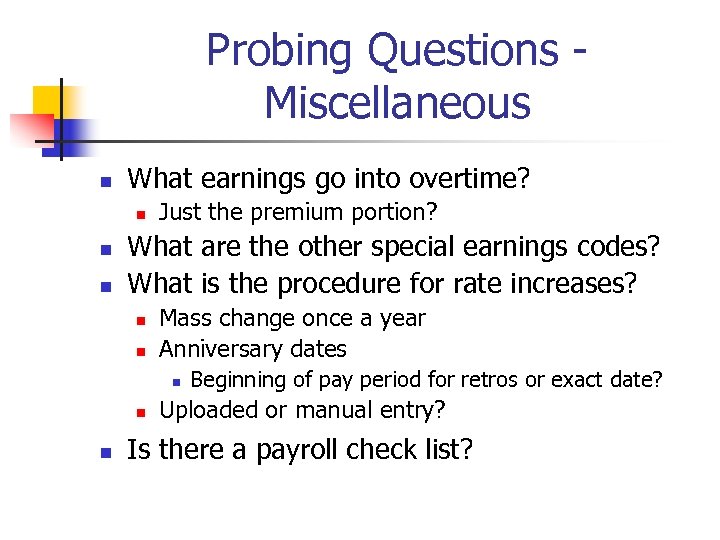 Probing Questions - Miscellaneous n What earnings go into overtime? n n n Just the premium portion? What are the other special earnings codes? What is the procedure for rate increases? n n Mass change once a year Anniversary dates n n n Beginning of pay period for retros or exact date? Uploaded or manual entry? Is there a payroll check list?
