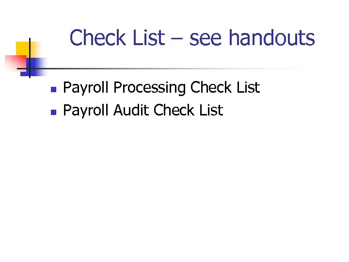 Check List – see handouts n n Payroll Processing Check List Payroll Audit Check List