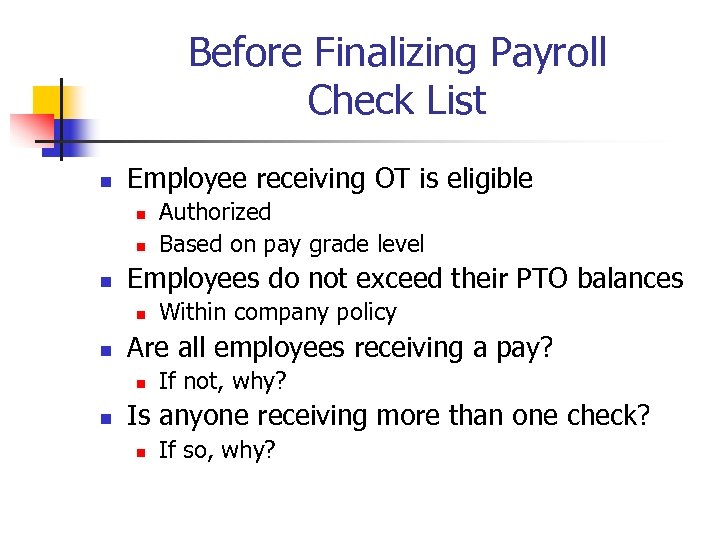 Before Finalizing Payroll Check List n Employee receiving OT is eligible n n n Employees do not exceed their PTO balances n n Within company policy Are all employees receiving a pay? n n Authorized Based on pay grade level If not, why? Is anyone receiving more than one check? n If so, why?