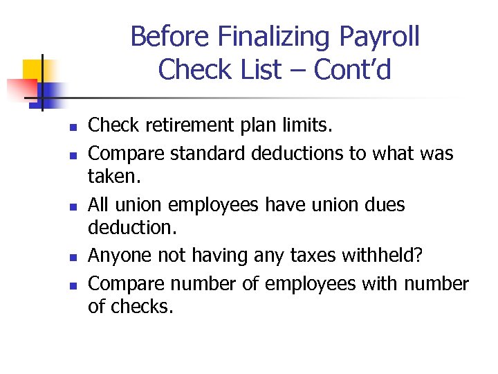 Before Finalizing Payroll Check List – Cont’d n n n Check retirement plan limits. Compare standard deductions to what was taken. All union employees have union dues deduction. Anyone not having any taxes withheld? Compare number of employees with number of checks.