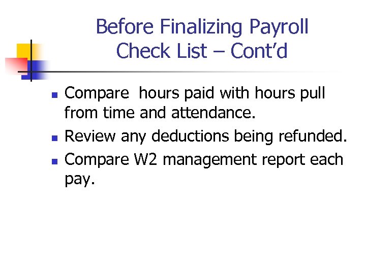 Before Finalizing Payroll Check List – Cont’d n n n Compare hours paid with hours pull from time and attendance. Review any deductions being refunded. Compare W 2 management report each pay.