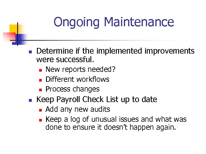 Ongoing Maintenance n Determine if the implemented improvements were successful. n n New reports needed? Different workflows Process changes Keep Payroll Check List up to date n n Add any new audits Keep a log of unusual issues and what was done to ensure it doesn’t happen again.