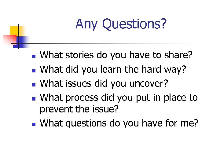 Any Questions? n n n What stories do you have to share? What did you learn the hard way? What issues did you uncover? What process did you put in place to prevent the issue? What questions do you have for me?