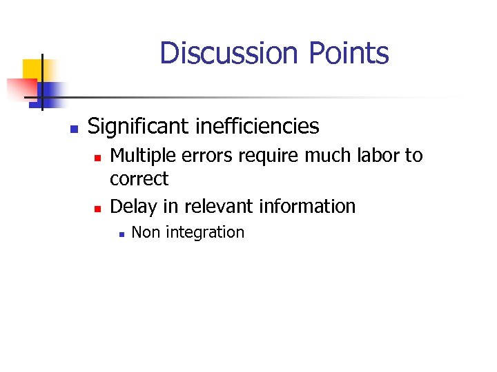 Discussion Points n Significant inefficiencies n n Multiple errors require much labor to correct Delay in relevant information n Non integration