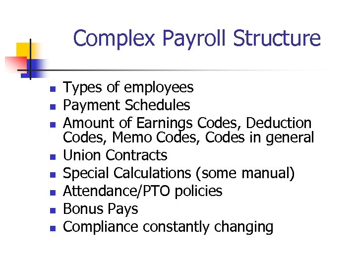 Complex Payroll Structure n n n n Types of employees Payment Schedules Amount of Earnings Codes, Deduction Codes, Memo Codes, Codes in general Union Contracts Special Calculations (some manual) Attendance/PTO policies Bonus Pays Compliance constantly changing