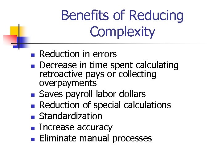 Benefits of Reducing Complexity n n n n Reduction in errors Decrease in time spent calculating retroactive pays or collecting overpayments Saves payroll labor dollars Reduction of special calculations Standardization Increase accuracy Eliminate manual processes