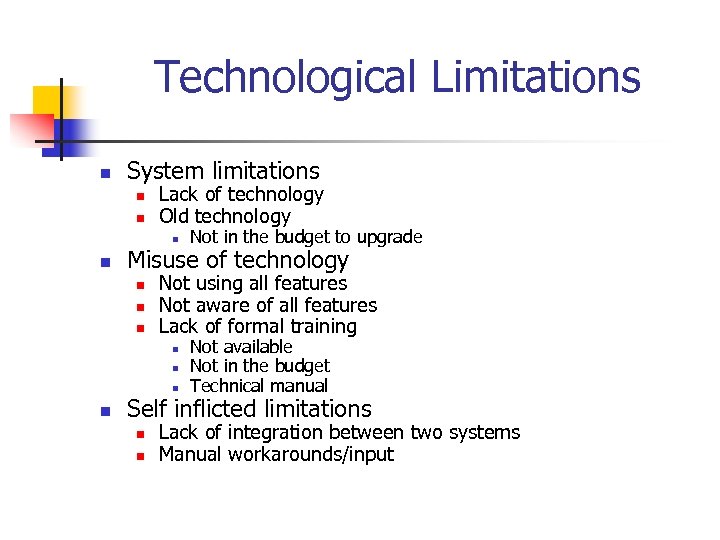 Technological Limitations n System limitations n n Lack of technology Old technology n n Misuse of technology n n n Not using all features Not aware of all features Lack of formal training n n Not in the budget to upgrade Not available Not in the budget Technical manual Self inflicted limitations n n Lack of integration between two systems Manual workarounds/input