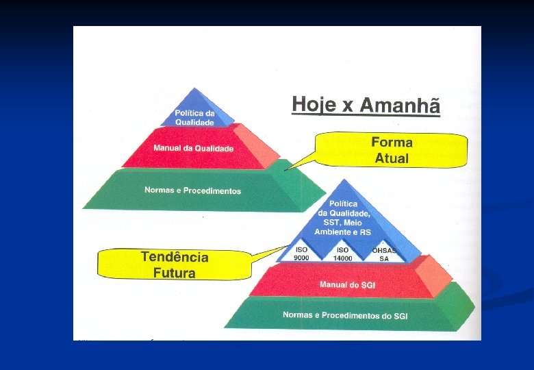 CERTIFICAÇÃO DA QUALIDADE n Depois da II Guerra Mundial n n MIL-Q-9858 : Sistema de especificação da qualidade MIL-I 45208: Exigência do sistema de inspeção. 1979 : BS 5750 n n 1987: 1ª. edição 1994: 2ª. edição 2000: 3ª. edição 2008: 4ª. edição