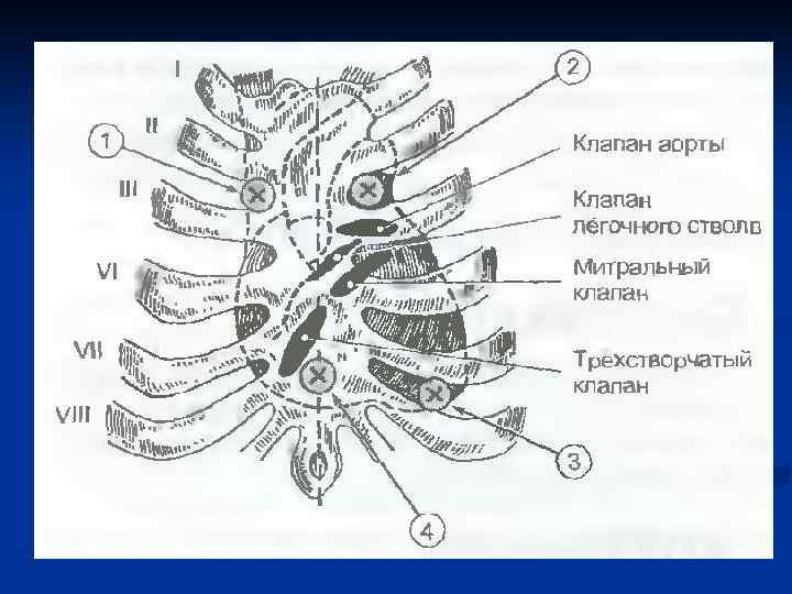 Места проекции клапанов сердца на переднюю грудную стенку n n Митральный клапан (МК) – место прикрепления к грудине хряща III ребра слева. Аортальный клапан (АК) – посередине грудины на уровне хрящей III ребер. Клапан легочного ствола (артерии) (КЛА) – во II межреберье слева у грудины. Трикуспидальный клапан (ТК) – на грудине, на середине расстояния между местом прикрепления к грудине хряща III ребра слева и хряща V ребра справа.