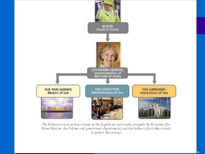 Role of the Citizen • democracy: voters choose the lawmakers • Everyone who is 18 or over is required by law to vote. – Citizens can be fined or go to court if they don’t vote. • Citizens vote for MPs -- the leader of the party that gets the most votes becomes the prime minister. • Voters do not vote for the head of state (Queen), the governor-general, or directly for the prime minister.