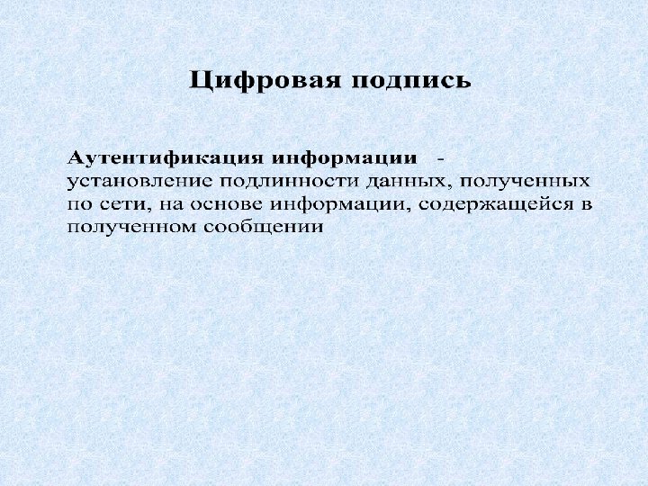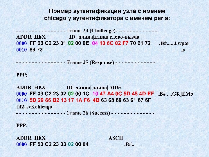 Paris Chicago, Parole Z Z Установление соединения, ввод имени Chicago 1 2 Запрос (ID, слово-вызов, Paris) Ввод пароля, вычисление дайджеста от пароля Z=d(parol), Отсылка ответа (d(ID, слово-вызов, Z), Chicago) 3 3 Извлечение из базы данных дайджеста от пароля Z, вычисление d(ID, слово-вызов, Z), сравнение с полученным d(ID, слово-вызов, Z), отправка сообщения об успешной аутентификации