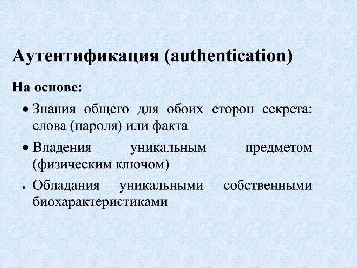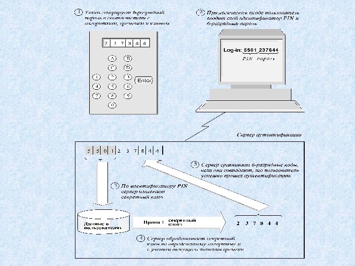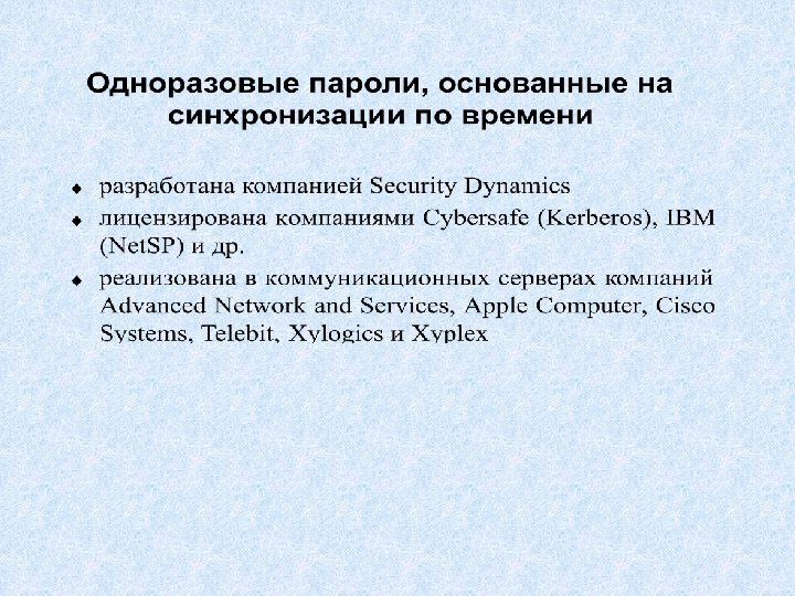 Программная система аутентификации на основе одноразовых паролей S/Key 1. Инициализация – задание разделяемого секрета Х 2. Аутентификатор вычисляет n-кратный дайджест от X и сохраняет его вместо X. 3. Аутентифицируемая сторона вычисляет (n-1)-кратный дайджест и посылает его аутентификатору 4. Аутентификатор вычисляет дайджест от принятого числа и сравнивает его с сохраненным n-кратным дайджестом 5. При каждой новой аутентификации число n уменьшается на единицу.