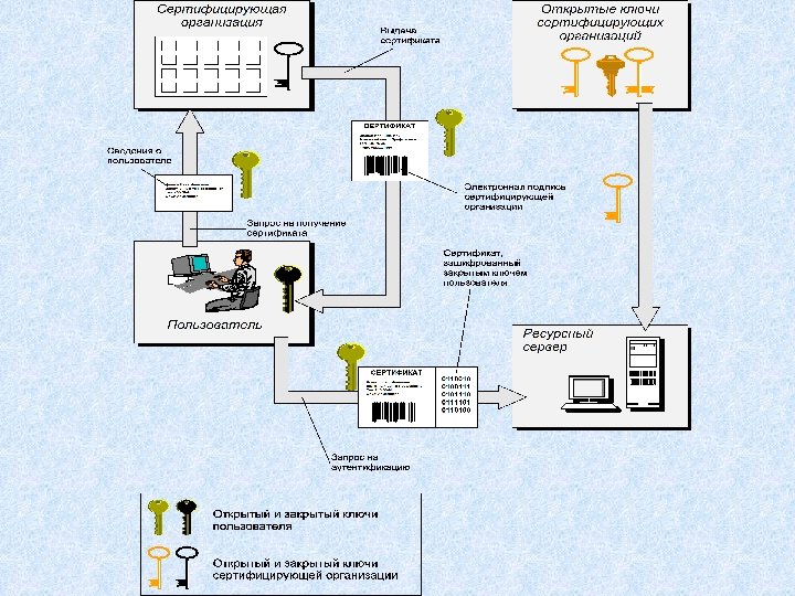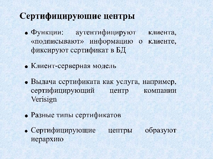 Аутентификация на основе сертификатов • Масштабируемая схема на основе открытых ключей • Сертификат (certificate) – электронный документ: (1) гарантирующий соответствие открытого ключа его владельцу (2) наделяющий владельца определенными правами по доступу к ресурсам • Сертификаты выдаются уполномоченными организациями – сертифицирующими центрами (certificate authority)