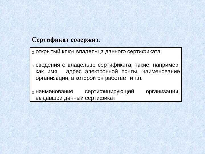 Структура сертификата Открытая часть • Открытый ключ • Сведения о владельце • Сведения о сертифицирующем центре Часть, зашифрованная закрытым ключом СA Часть, зашифрованная закрытым ключом владельца