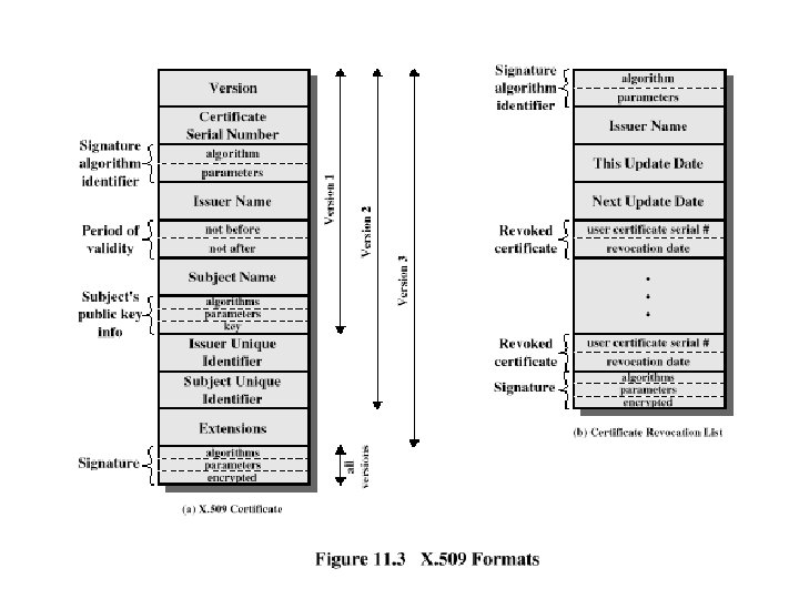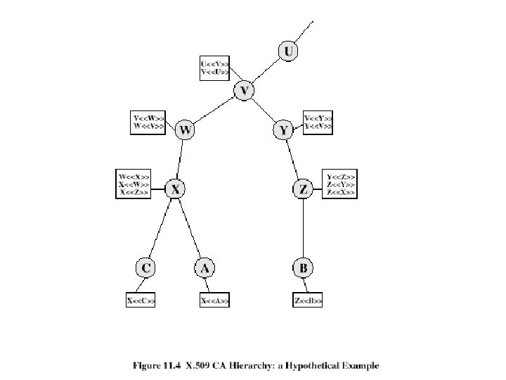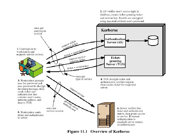 Overview of Kerberos Server Authentication Server AS 1 2 Ticket Granted Server TGS 3 4 5 Client C Server D 6 1 IDc, IDtgs, TS 1 2 Ekc[Kc, tgs, IDtgs, TS 2, Lifetime 2, Tickettgs] Tickettgs=Ektgs[Kc, tgs, IDc, ADc, IDtgs, TS 2, Lifetime 2] 3 IDv, Tickettgs, Authenticatorc 4 Ekc, tgs[Kc, v, IDv, TS 4, Ticketv] Ticketv =Ekv[Kc, v, IDc, ADc, IDv, TS 4, Lifetime 4] Authenticatorc=Ekc, tgs[IDc, ADc, TS 3] 5 Ticketv, Authenticatorc 6 Ekc, v [TS 5+1 ] Authenticatorc=Ekc, v[IDc, ADc, TS 5]