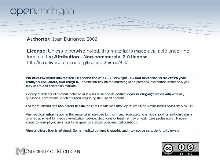 Author(s): Joan Durrance, 2009 License: Unless otherwise noted, this material is made available under the terms of the Attribution - Non-commercial 3. 0 license http: //creativecommons. org/licenses/by-nc/3. 0/ We have reviewed this material in accordance with U. S. Copyright Law and have tried to maximize your ability to use, share, and adapt it. The citation key on the following slide provides information about how you may share and adapt this material. Copyright holders of content included in this material should contact open. michigan@umich. edu with any questions, corrections, or clarification regarding the use of content. For more information about how to cite these materials visit http: //open. umich. edu/education/about/terms-of-use. Any medical information in this material is intended to inform and educate and is not a tool for self-diagnosis or a replacement for medical evaluation, advice, diagnosis or treatment by a healthcare professional. Please speak to your physician if you have questions about your medical condition. Viewer discretion is advised: Some medical content is graphic and may not be suitable for all viewers.