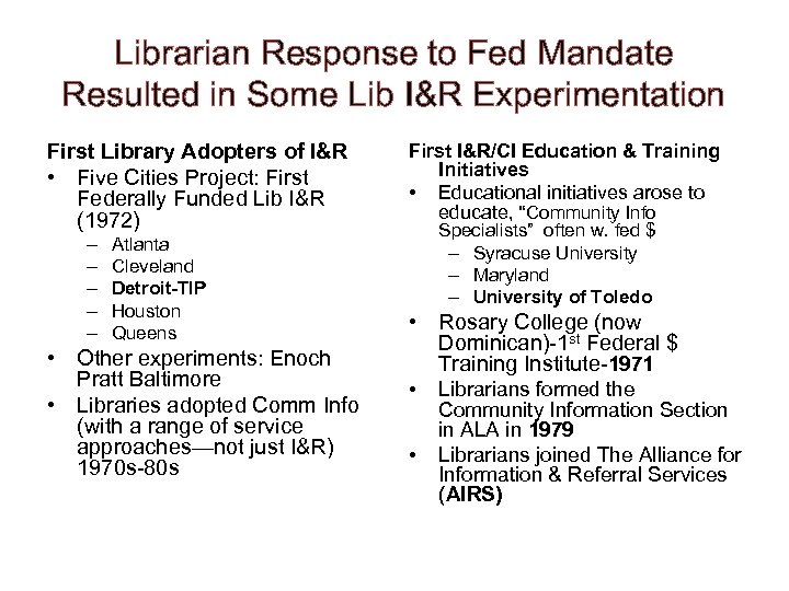 Librarian Response to Fed Mandate Resulted in Some Lib I&R Experimentation First Library Adopters of I&R • Five Cities Project: First Federally Funded Lib I&R (1972) – – – Atlanta Cleveland Detroit-TIP Houston Queens • Other experiments: Enoch Pratt Baltimore • Libraries adopted Comm Info (with a range of service approaches—not just I&R) 1970 s-80 s First I&R/CI Education & Training Initiatives • Educational initiatives arose to educate, “Community Info Specialists” often w. fed $ – Syracuse University – Maryland – University of Toledo • Rosary College (now Dominican)-1 st Federal $ Training Institute-1971 • Librarians formed the • Community Information Section in ALA in 1979 Librarians joined The Alliance for Information & Referral Services (AIRS)