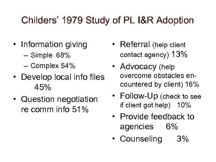 Childers’ 1979 Study of PL I&R Adoption • Information giving – Simple 68% – Complex 54% • Referral (help client contact agency) 13% • Advocacy (help overcome obstacles en • Develop local info files countered by client) 16% 45% • Question negotiation • Follow-Up (check to see if client got help) 10% re comm info 51% • Provide feedback to agencies 6% • Counseling 3%