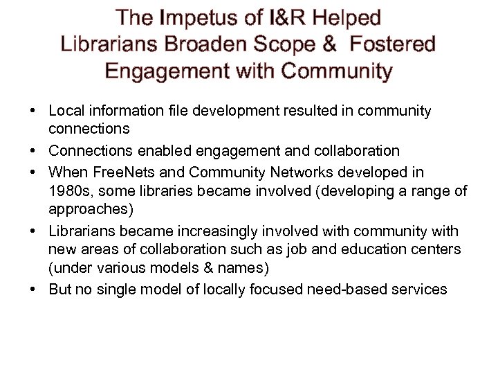 The Impetus of I&R Helped Librarians Broaden Scope & Fostered Engagement with Community • Local information file development resulted in community connections • Connections enabled engagement and collaboration • When Free. Nets and Community Networks developed in 1980 s, some libraries became involved (developing a range of approaches) • Librarians became increasingly involved with community with new areas of collaboration such as job and education centers (under various models & names) • But no single model of locally focused need-based services