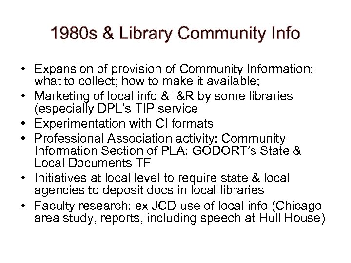 1980 s & Library Community Info • Expansion of provision of Community Information; what to collect; how to make it available; • Marketing of local info & I&R by some libraries (especially DPL’s TIP service • Experimentation with CI formats • Professional Association activity: Community Information Section of PLA; GODORT’s State & Local Documents TF • Initiatives at local level to require state & local agencies to deposit docs in local libraries • Faculty research: ex JCD use of local info (Chicago area study, reports, including speech at Hull House)