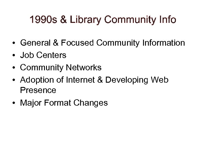 1990 s & Library Community Info • • General & Focused Community Information Job Centers Community Networks Adoption of Internet & Developing Web Presence • Major Format Changes